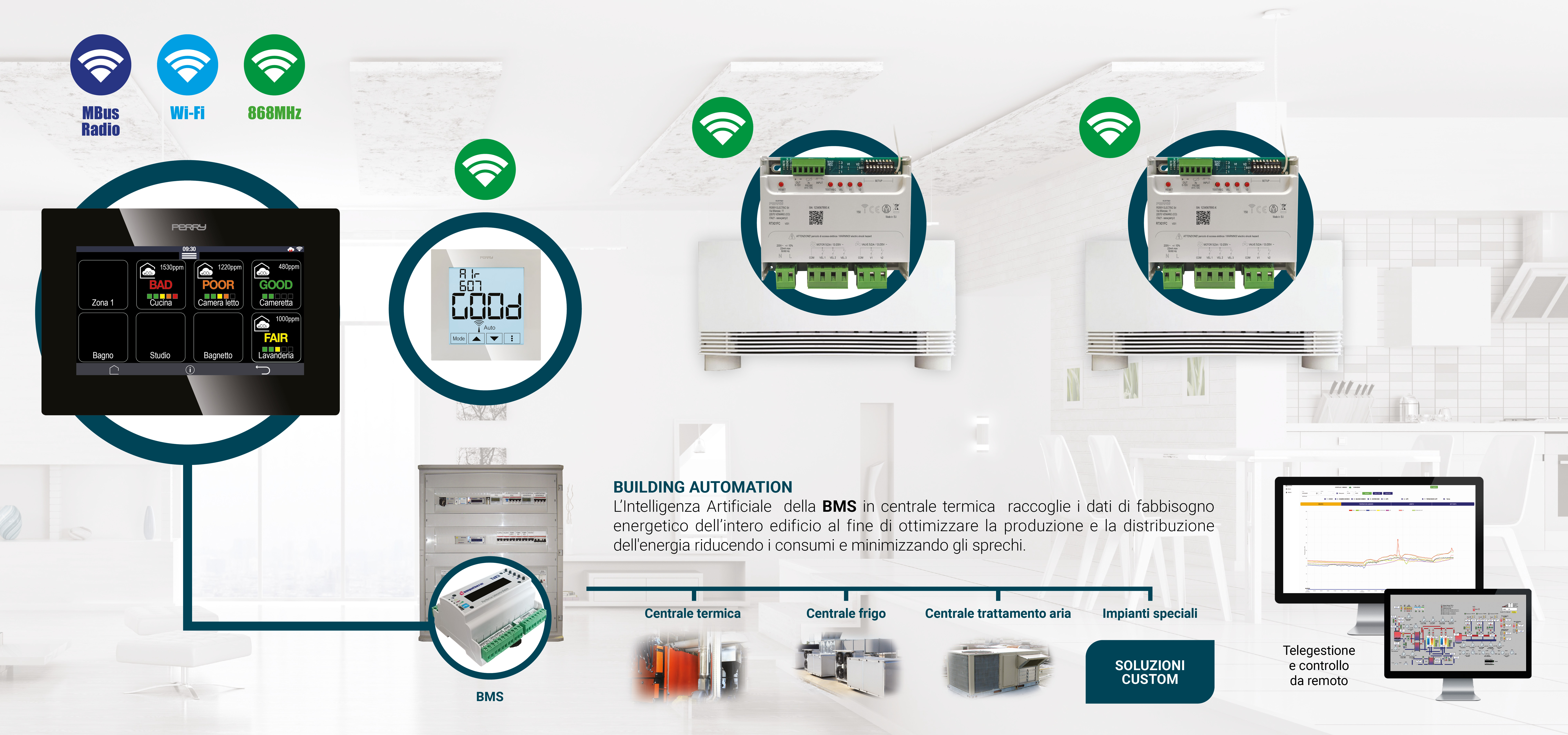 Los repartidores de calor, instalados en los radiadores, contabilizan el consumo de energía y envían los datos a la centralita C.DOM a través de una comunicación inalámbrica compatible con OMS.