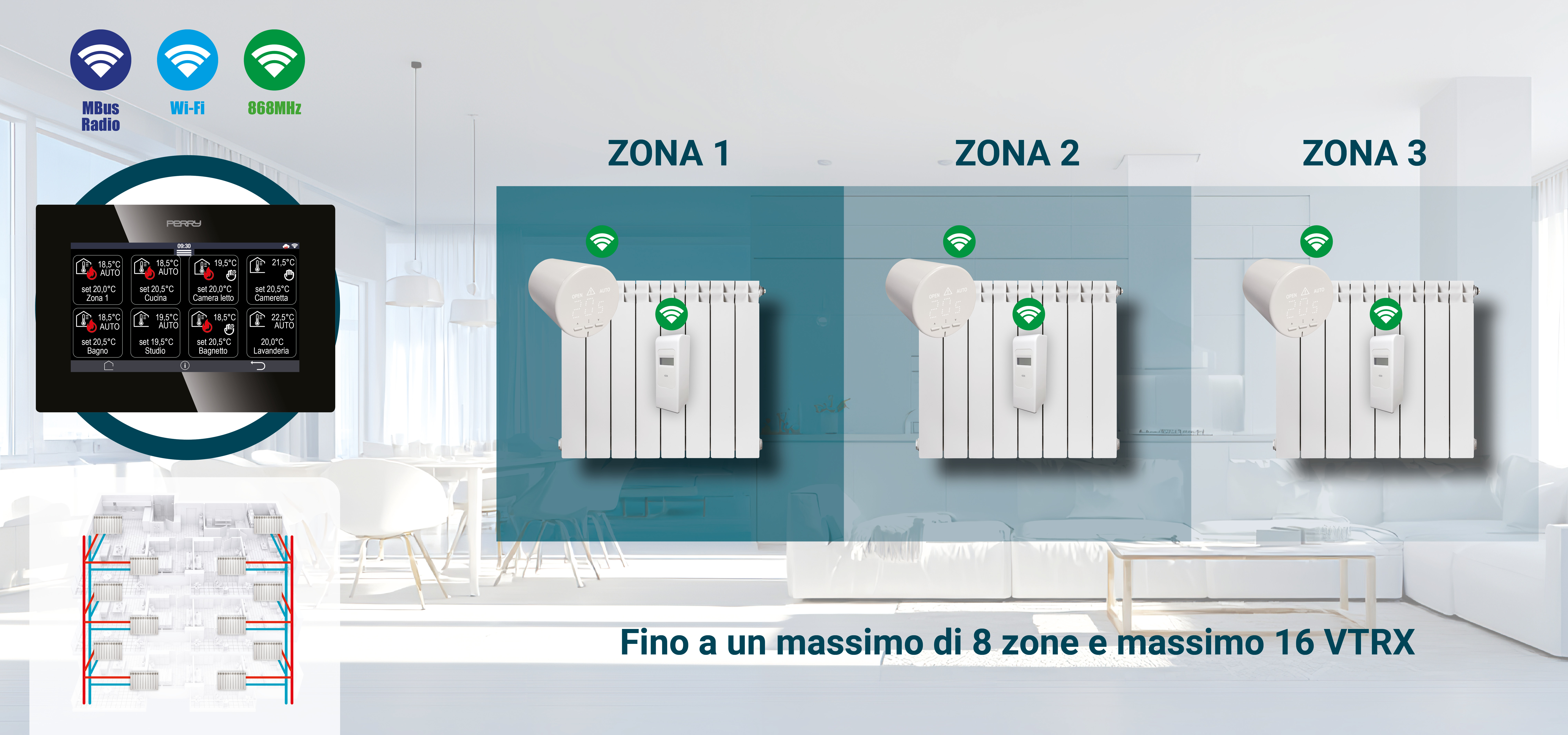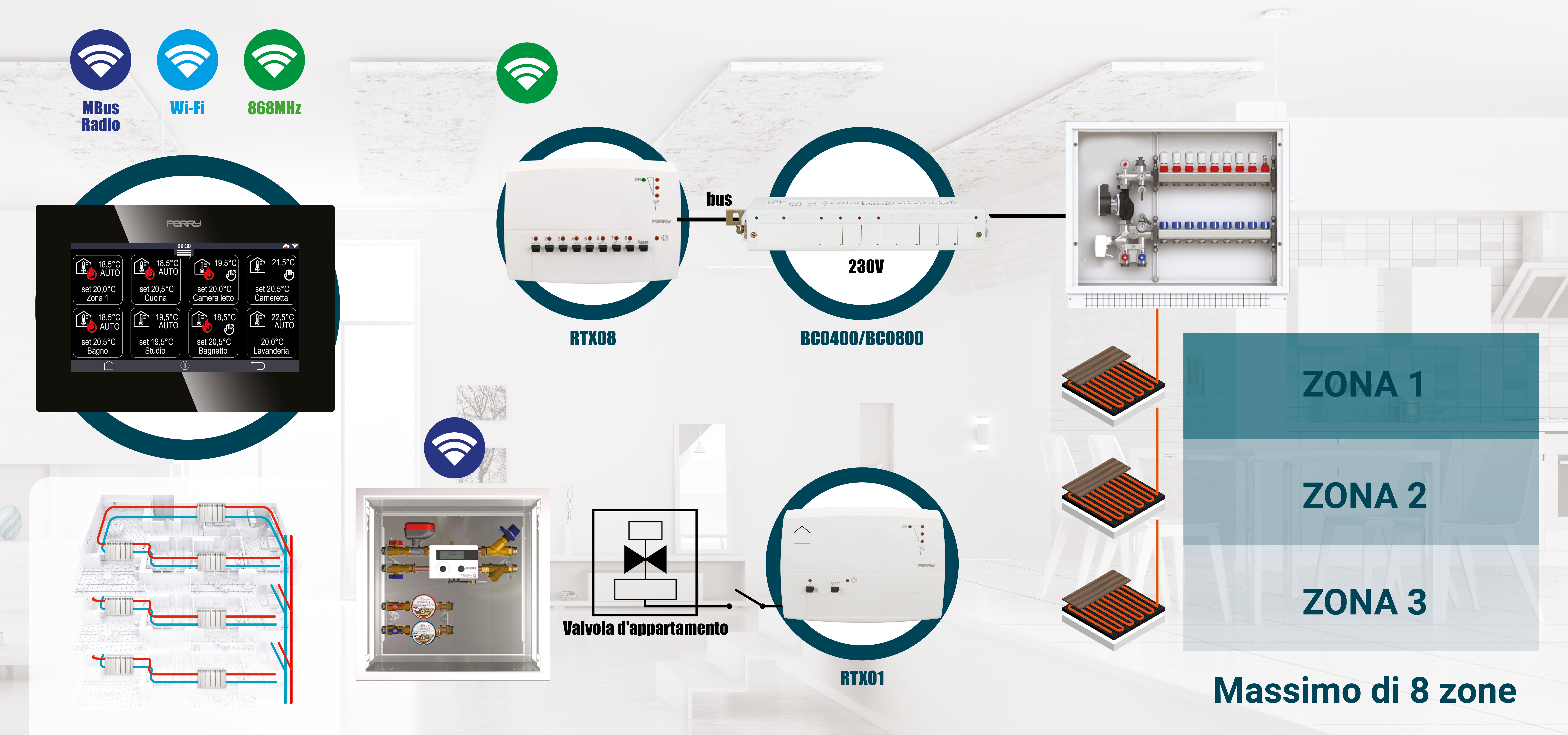 En el caso de la distribución en columna vertical, en la que el fluido termovector atraviesa la columna en varios pisos, la termorregulación del local se gestiona desde el C.DOM y desde las válvulas electrónicas VTRX que regulan el caudal de las válvulas modulando este en función de la orden inalámbrica recibida del C.DOM.