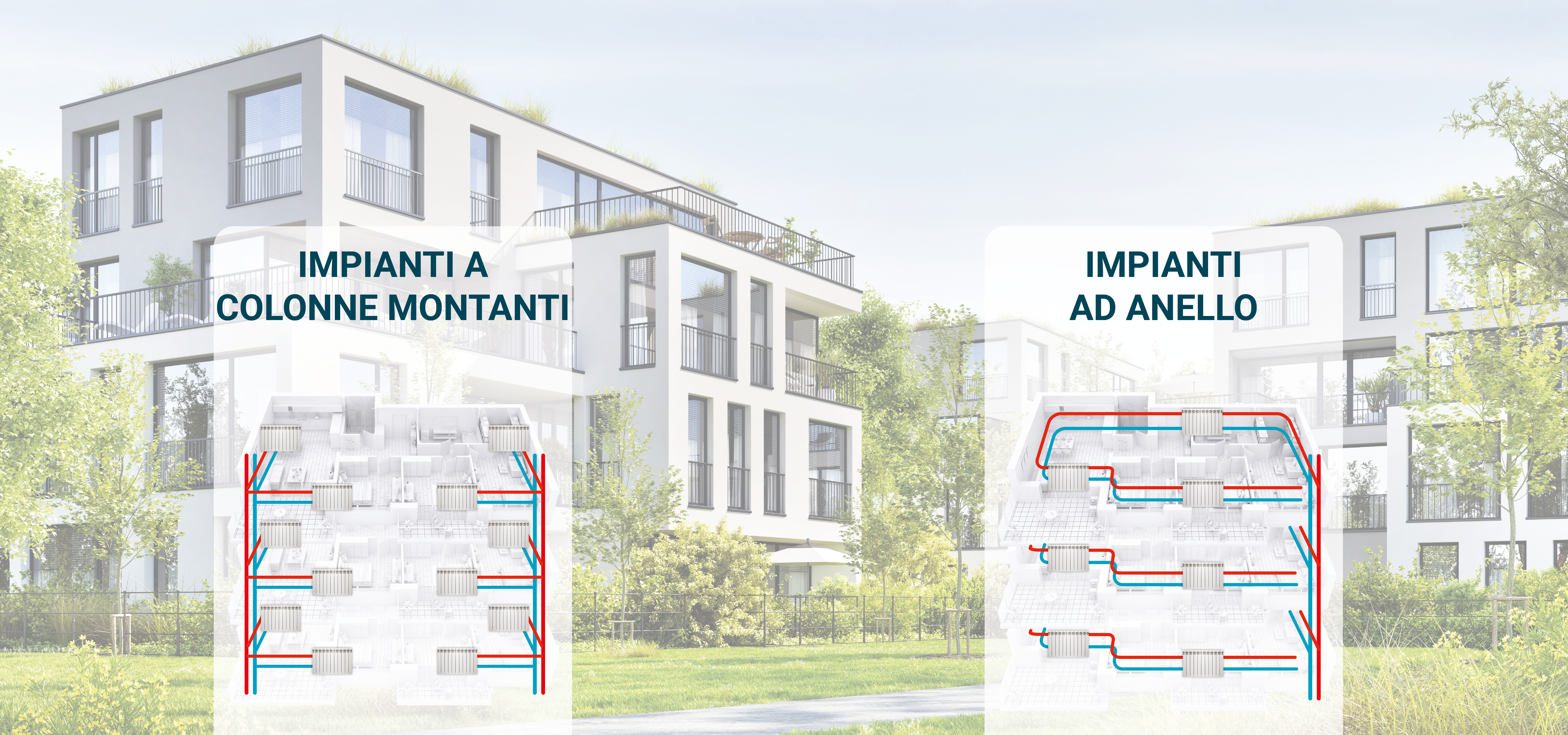 El sistema C.DOM se integra a la perfección con los diferentes tipos de bloques de apartamentos, tanto en el caso de distribución por columna vertical como en el caso de distribución por bucle.