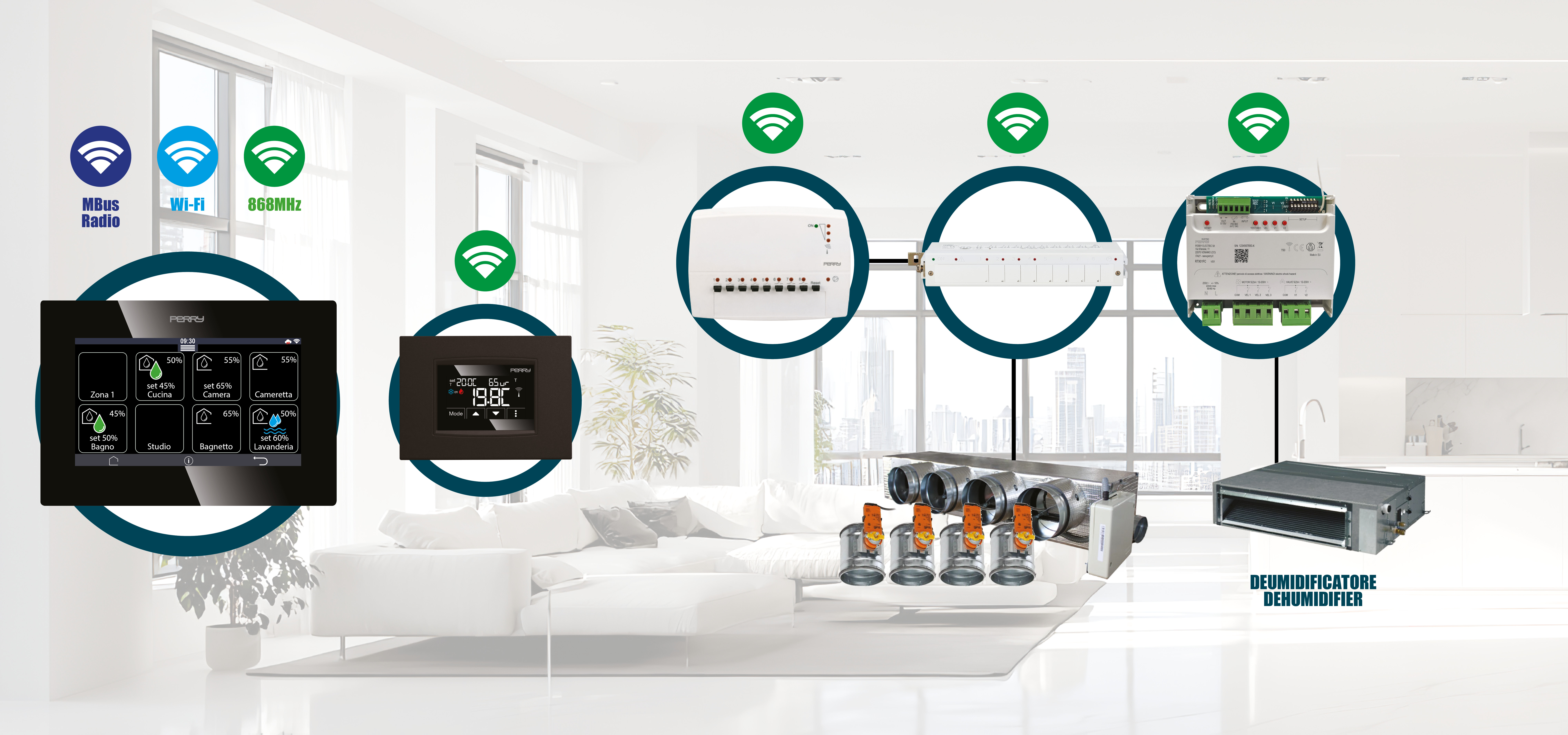 En el caso de que exista un bucle de distribución en el que el fluido termovector circule por el interior del piso a través de una válvula de área, el control de la temperatura ambiente lo gestiona el C.DOM y, si existe un sistema radiante con colectores de distribución, las barras de potencia.
