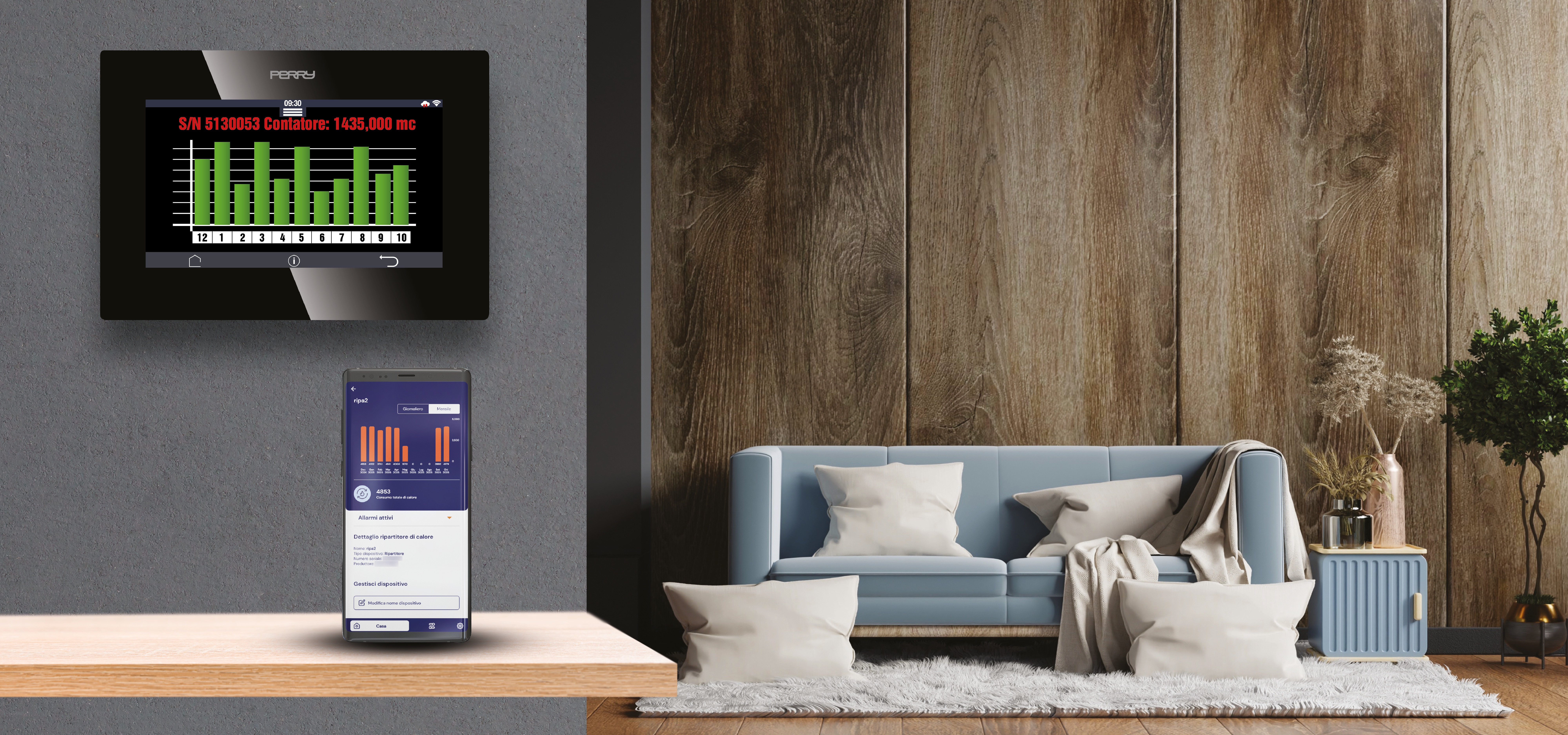 I contatori di energia e i contatori di acqua sanitaria comunicano le misure a C.DOM tramite radiofrequenza rendendo disponibili i dati di consumo sia sul display a colori del cronotermostato multizona che da remoto tramite APP.