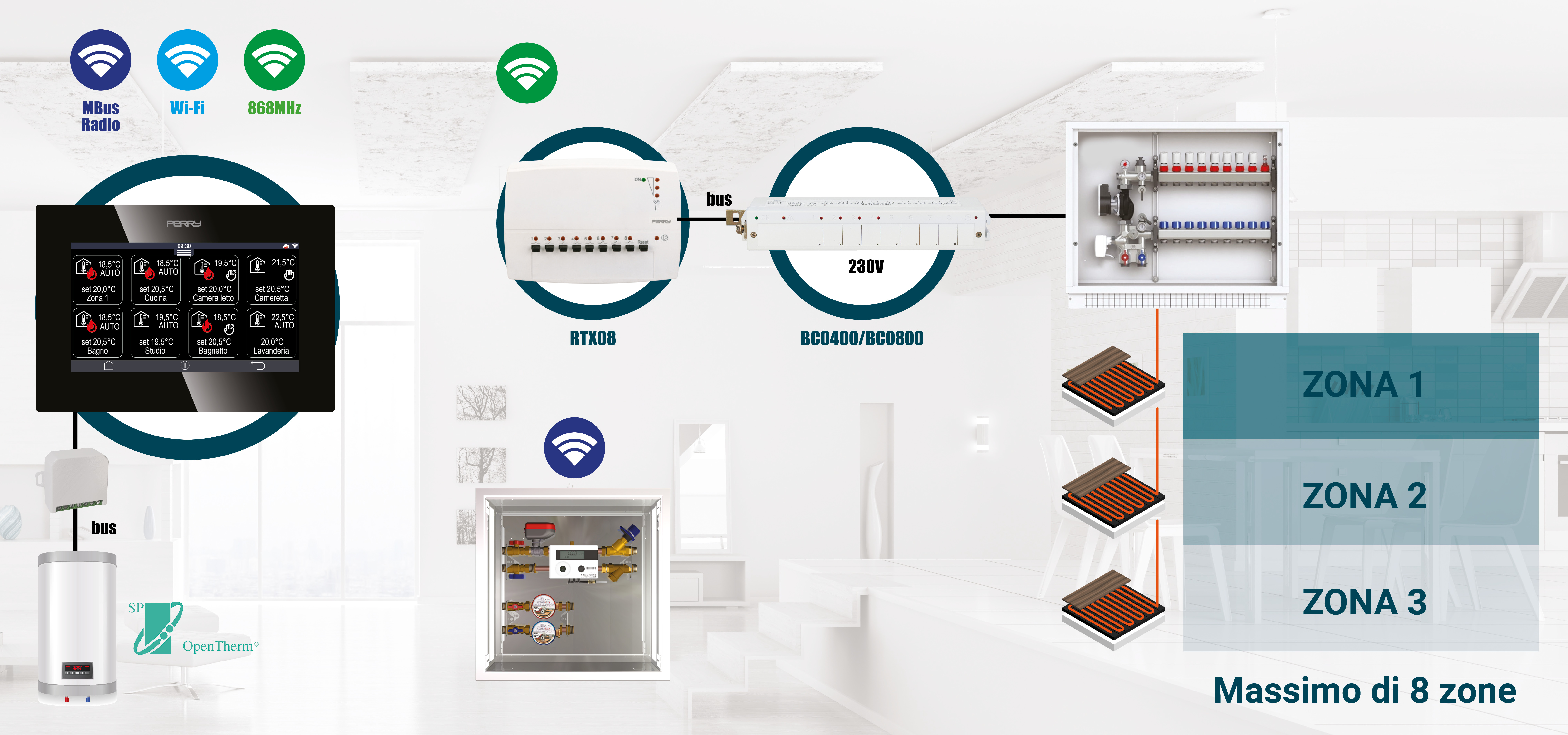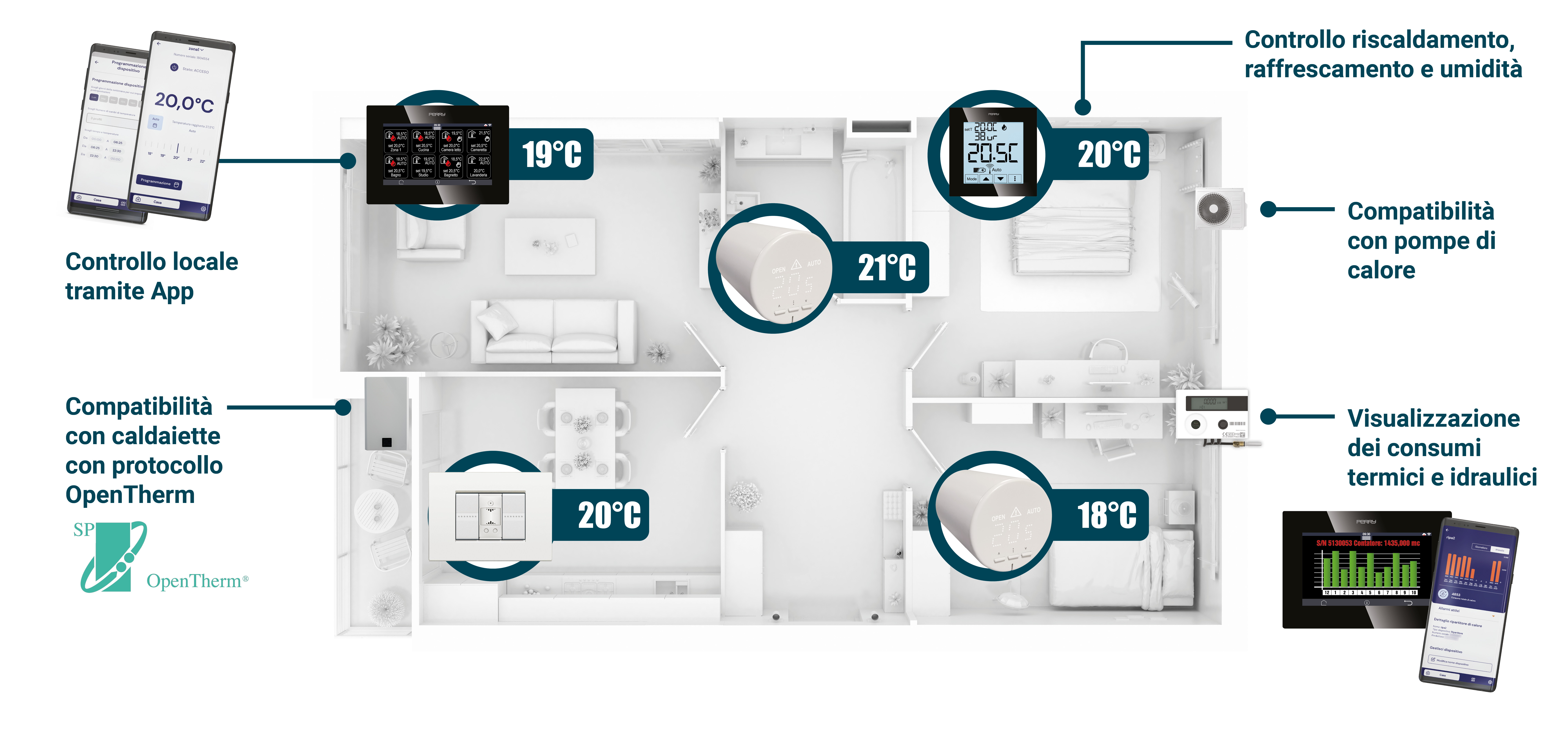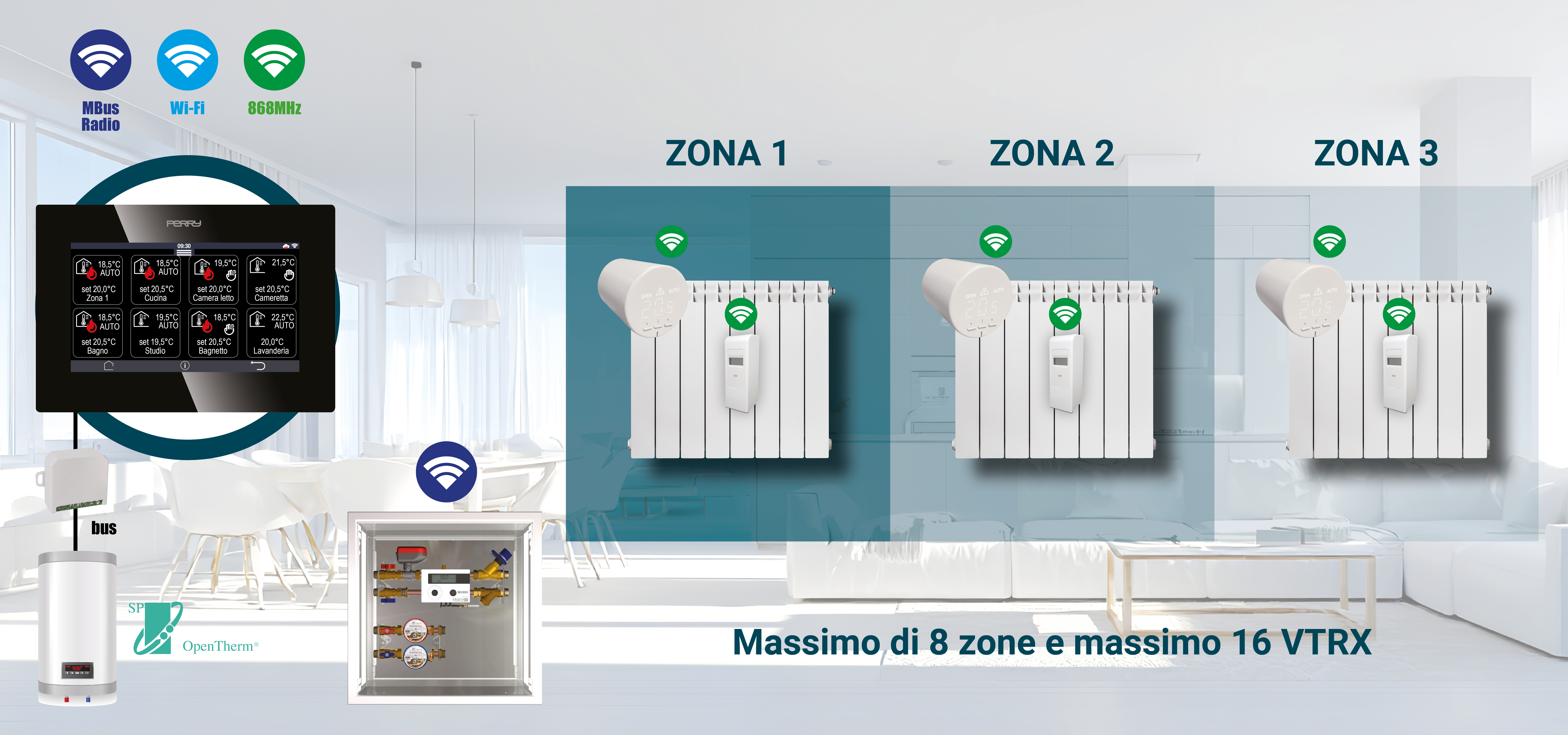 In ogni zona climatica è possibile installare termostati, termoumidostati oppure uno dei sensori di temperatura (da parete o da incasso). Tutte le comunicazioni avvengono tramite onde radio